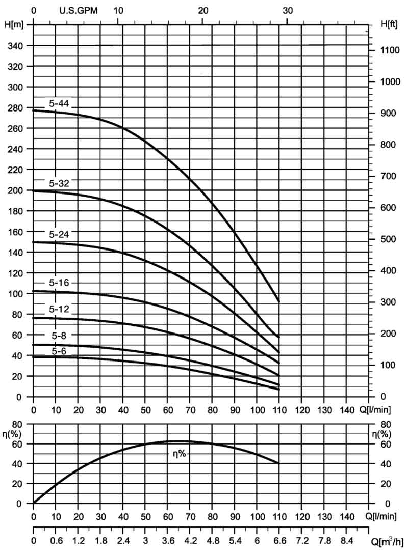 Die Ebara 4WN 5-44 Brunnenpumpe ist eine mehrstufige Pumpe für Fördermengen bis 6m³/h und Förderhöhen bis 278m.