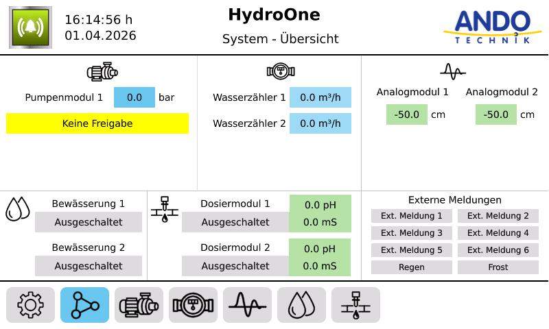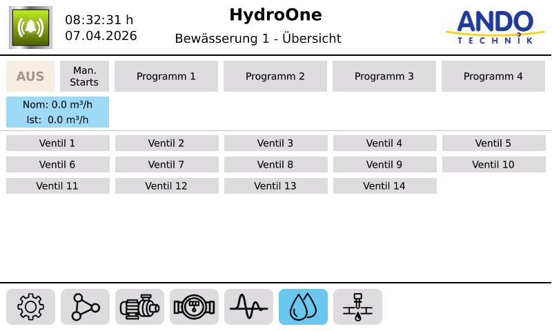 Die Steuerung hydroOne stellt eine universelle Lösung für die verschiedensten Anwendungen in den Bereichen Bewässerung und Wassermanagement dar. Die Software besteht aus unterschiedlichen Modulen, welche universell konfiguriert werden könnne. So ist es zum Beispiel möglich die Ventile einer Bewässerungsanlage intelligent zu steuern und passgenau zu den dort benötigten Wassermengen eine Druckerhöhungsanlage mit mehreren frequenzgesteuerten Wasserpumpen zu betreiben. Bei Bedarf können z.B. noch Vorlagebehälter mit verschnittenem Wasser gefüllt werden und dem Gießwasser Dünger geregelt zugeführt werden. All diese Funktionen sind in einer Steuerung integriert, haben ein einheitliches einfaches Bedienkonzept und können bei Bedarf über eine Cloud anbindung ferngesteuert und überwacht werden.